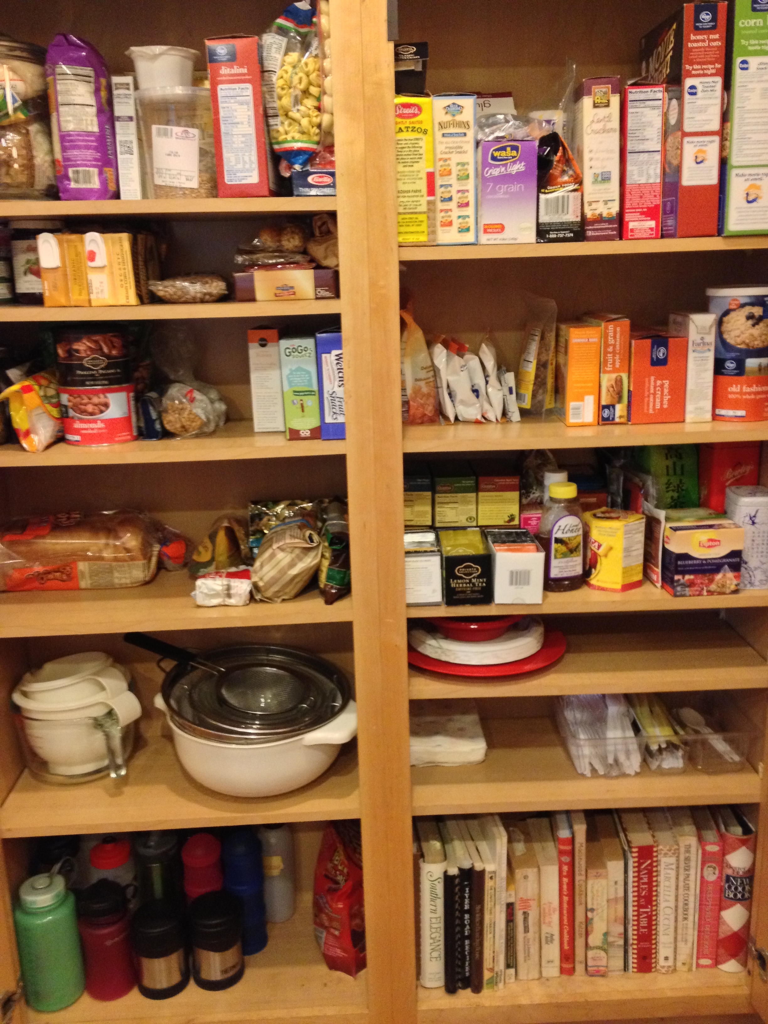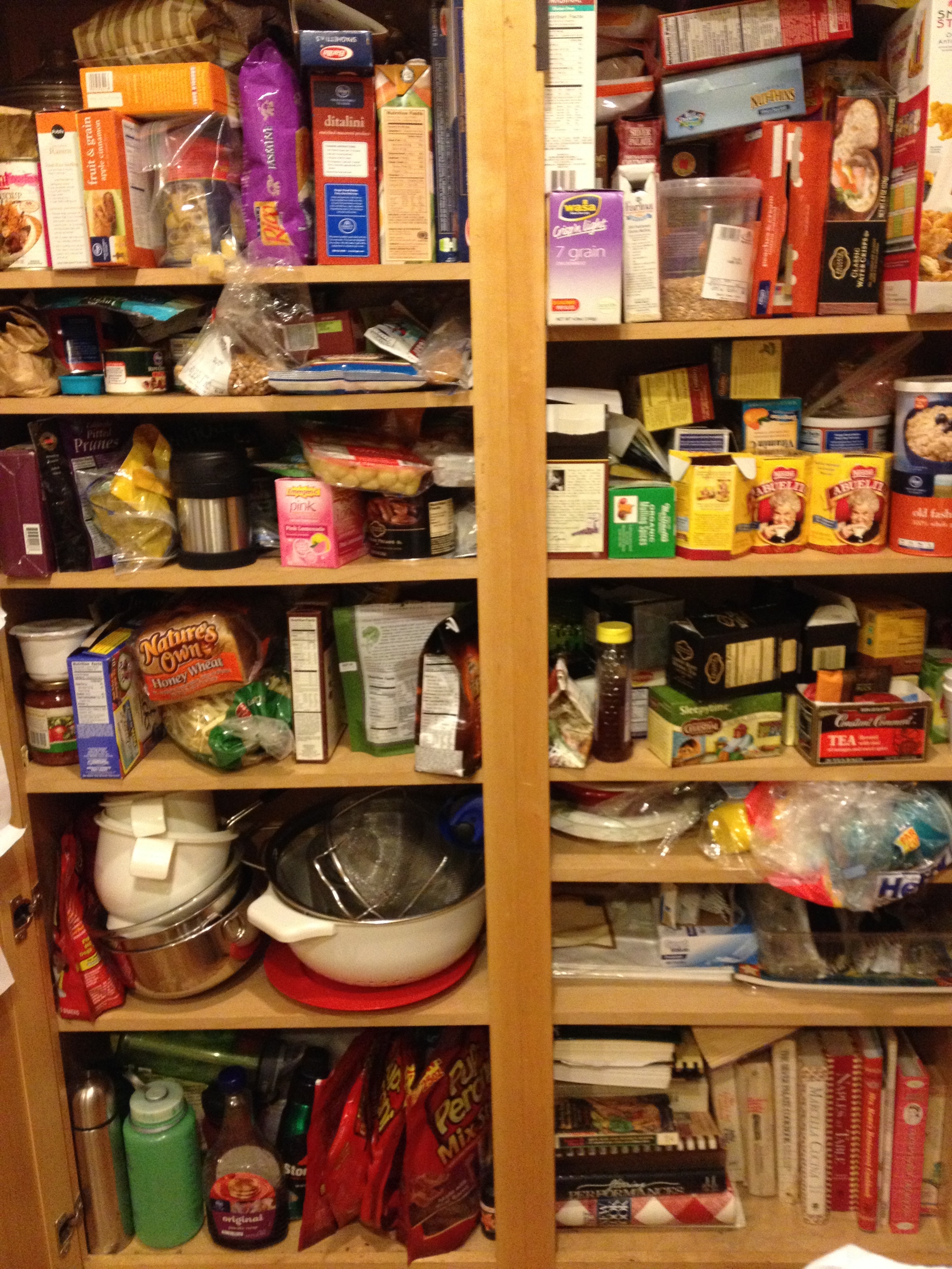 I mean look at all that stuff, one thing piled on top of another, and nothing within reach. Several times a day, I open up the pantry and cuss at the chaos, pull out whatever I need, and then quickly rearrange the piles to keep them from tumbling out onto the floor before I close the pantry doors. I reminds me of a line I once heard from a stand-up comedian:
