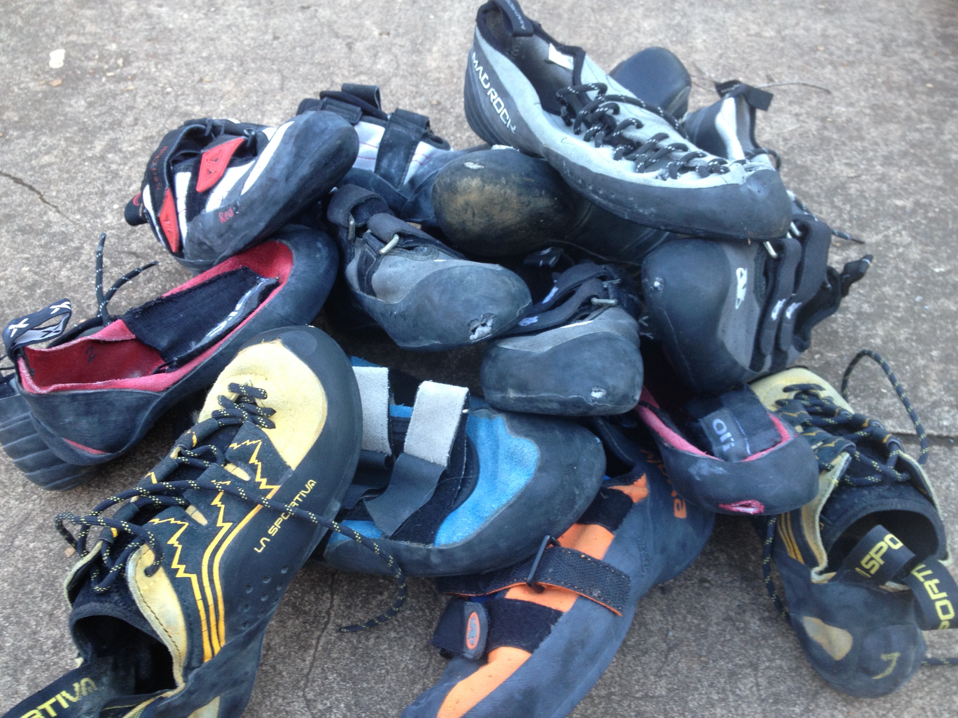 So today, I tossed out 17 climbing shoes–yup, 8 and a half pairs. In addition to everything I chucked, I did actually find two pairs that were in good enough condition to pass along to my son’s climbing coach as spares to keep on hand. A third pair were in good condition, but too small for one climber in the family and too big for another. I’ll hold onto that pair for a clearly defined future use, once a little girl’s foot grows into a size 4.