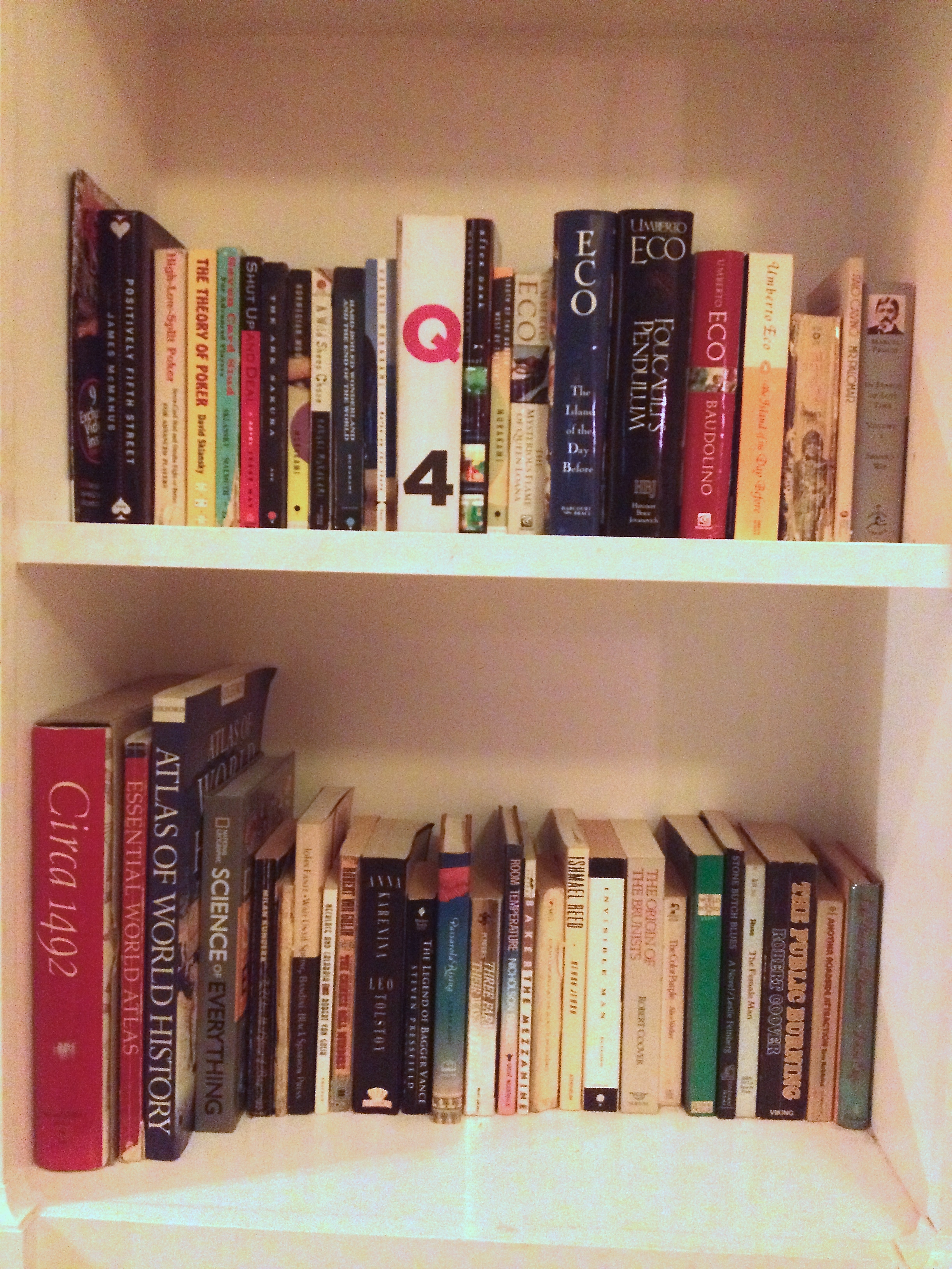 With a little rearranging and some selective purging, I managed to get rid of a large tote bag filled to the brim of books that I will probably never want to reread–and I would doubt anyone else in the house would have much use for. I’m not too happy about the arrangement of books that remain on these two shelves (the Library of Congress certainly wouldn’t approve), but it is certainly an improvement.