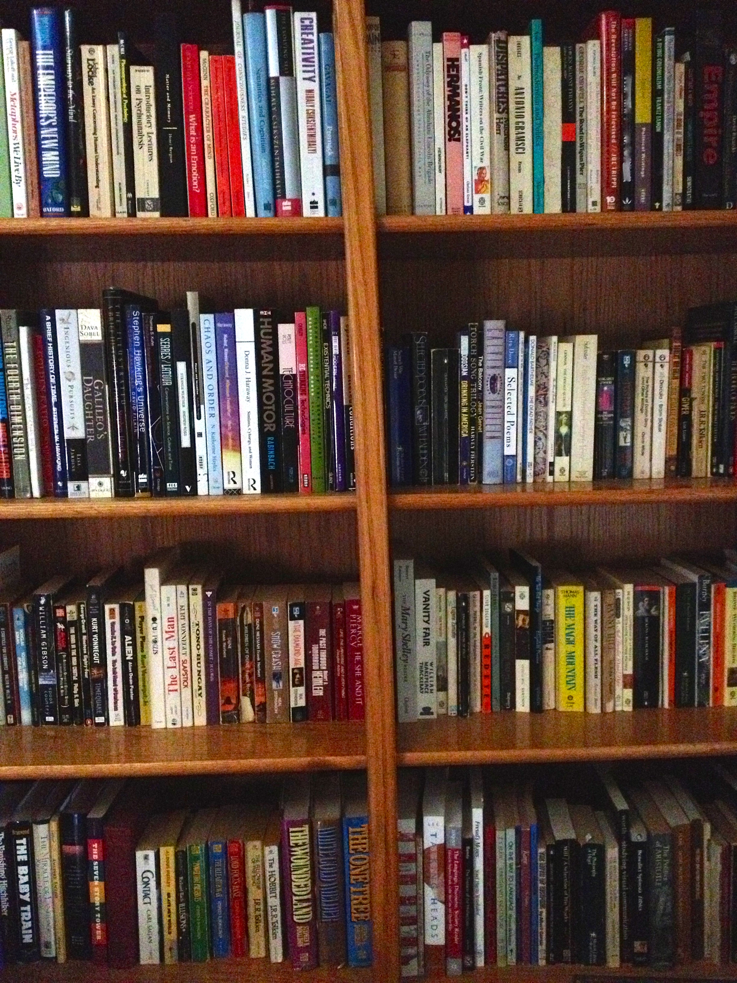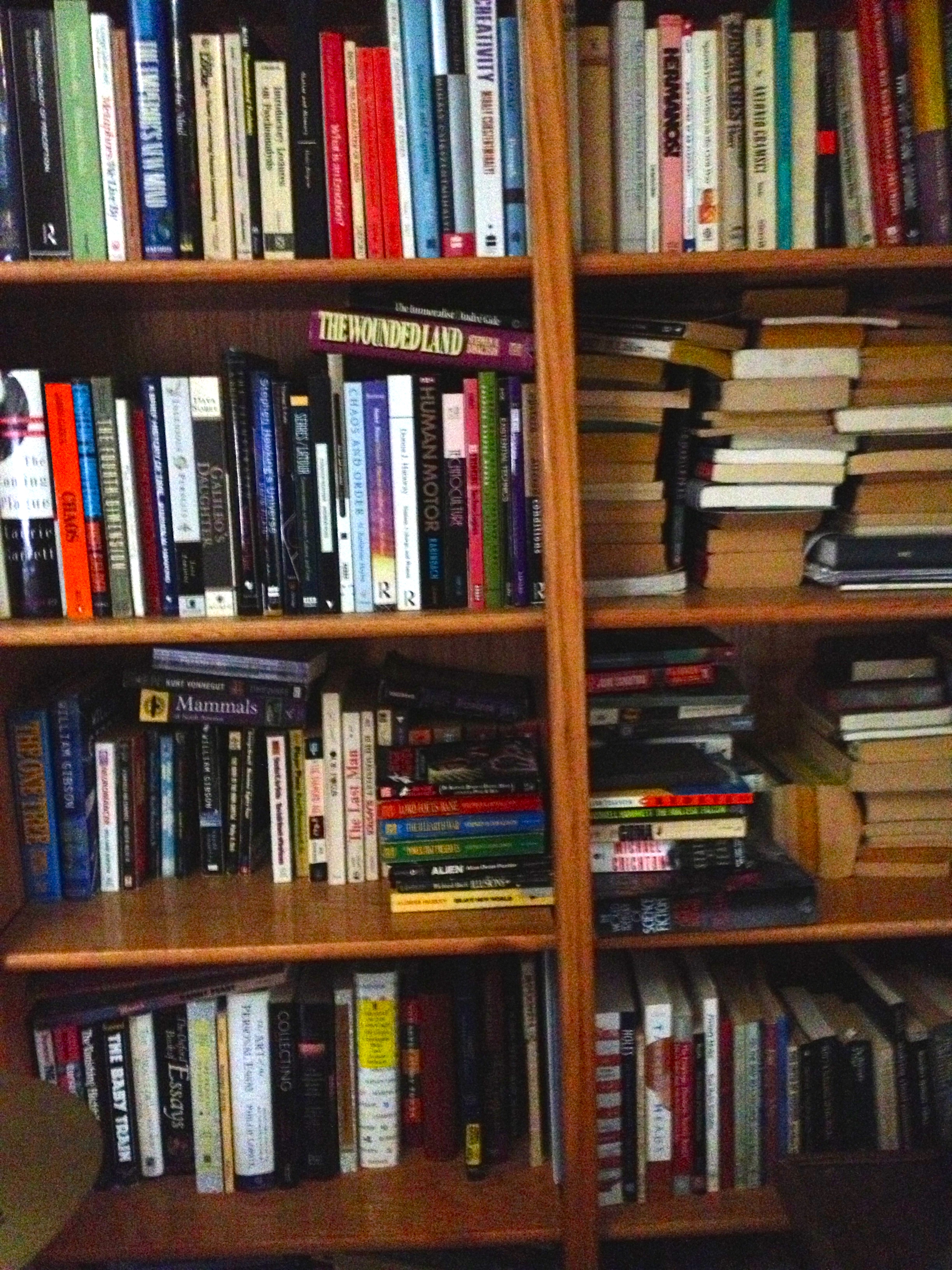 The root problem: books are fetish items for me–no, not that kind of fetish, but their material presence, stacked on shelves or piled on the floor, serves as a talisman of a sort–charms that strengthen and maintain that illusion I have of myself (and isn’t that whatΒ  ego is?) as a well-read, educated, and cultured individual.
