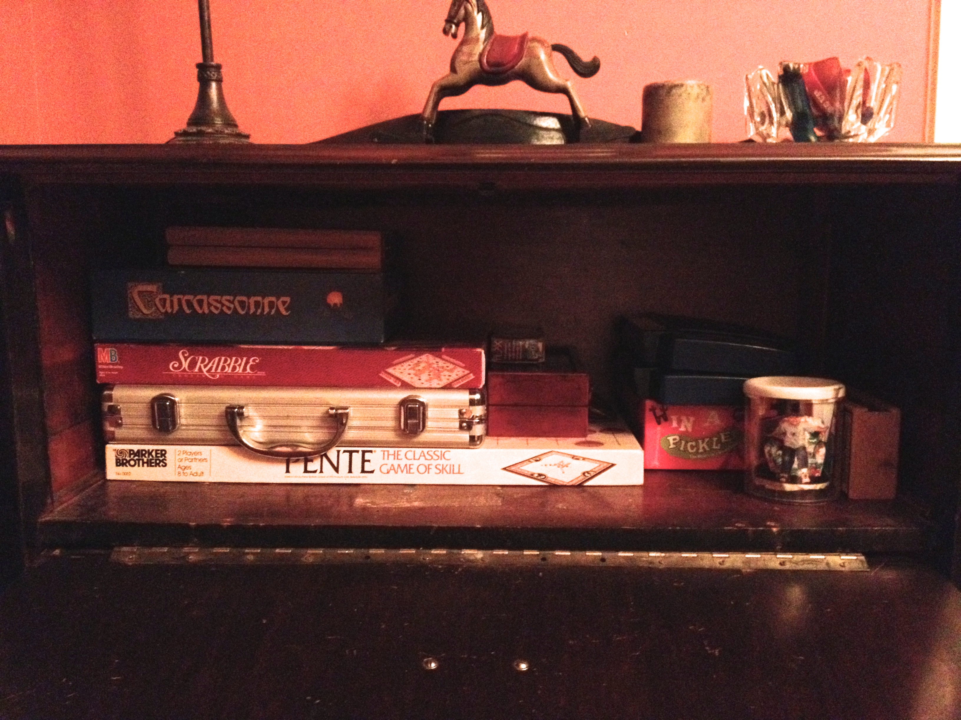 We have two cabinets in our house with stacks of games. This one is in the front room; the other is tucked away in the living room. We also have a closet stuffed with games, toys, and craft supplies, but we’re not going to talk about that one today….