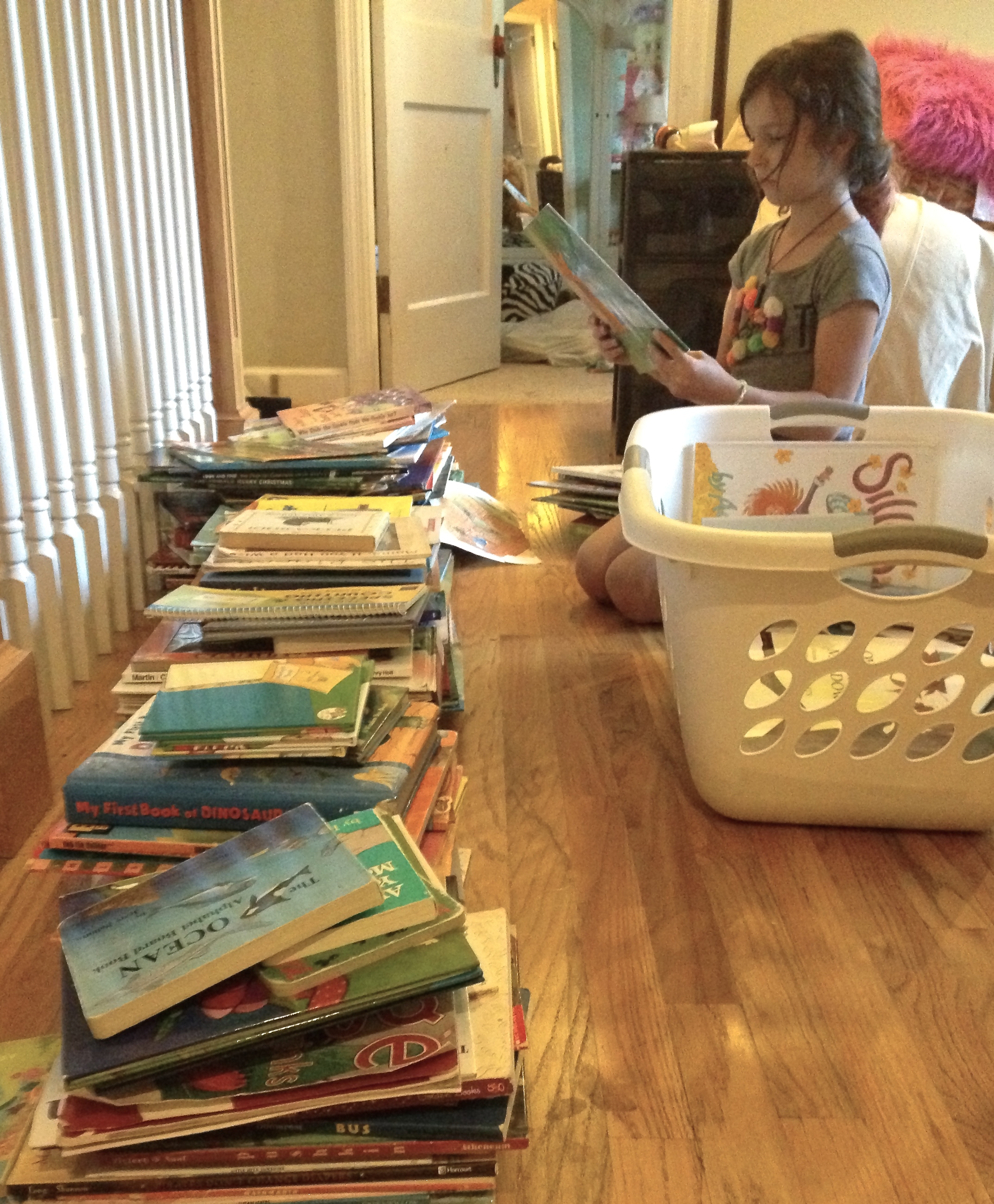 I explained that these books were all the books that I thought she had outgrown–“baby books” as I called them: board books, oversized picture books, level one readers, etc. I reassured her that I had already saved quite a few “good” books, even some picture books, that were still on her shelves in her room, but these stacks were the books we were going to give away.
