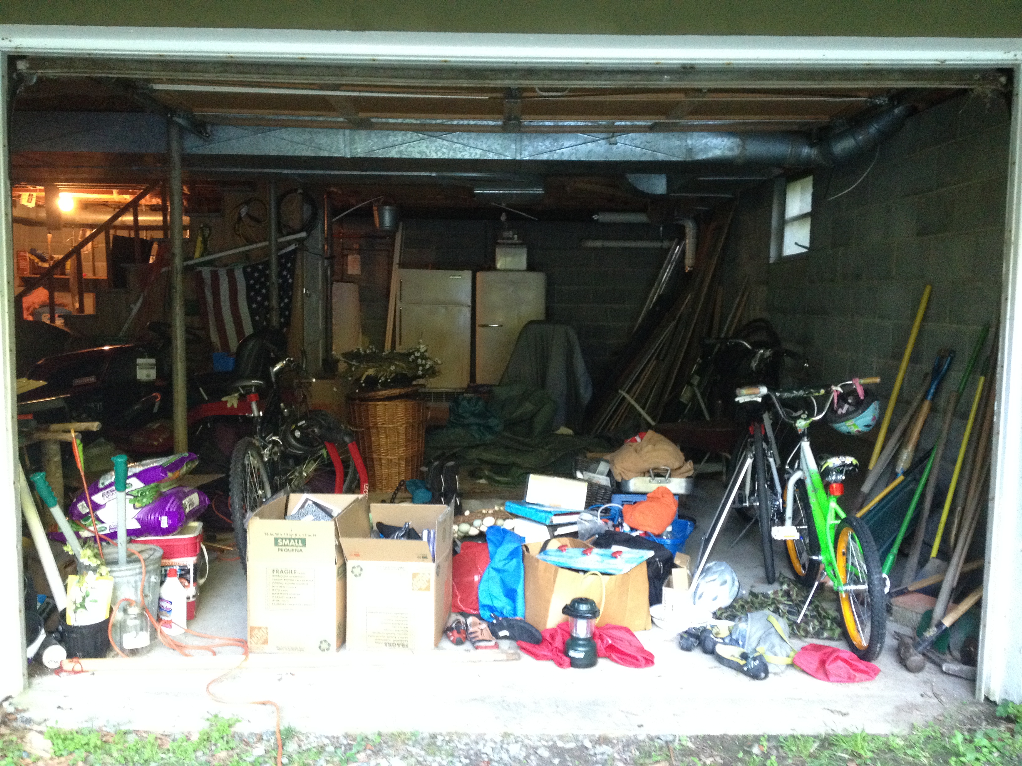 Then there’s also the mixture of two eras of clutter–what had already been down there prior to our arrival, plus all the stuff that we added into the mix. The result has been a rather chaotic garage, with very little space to move about.